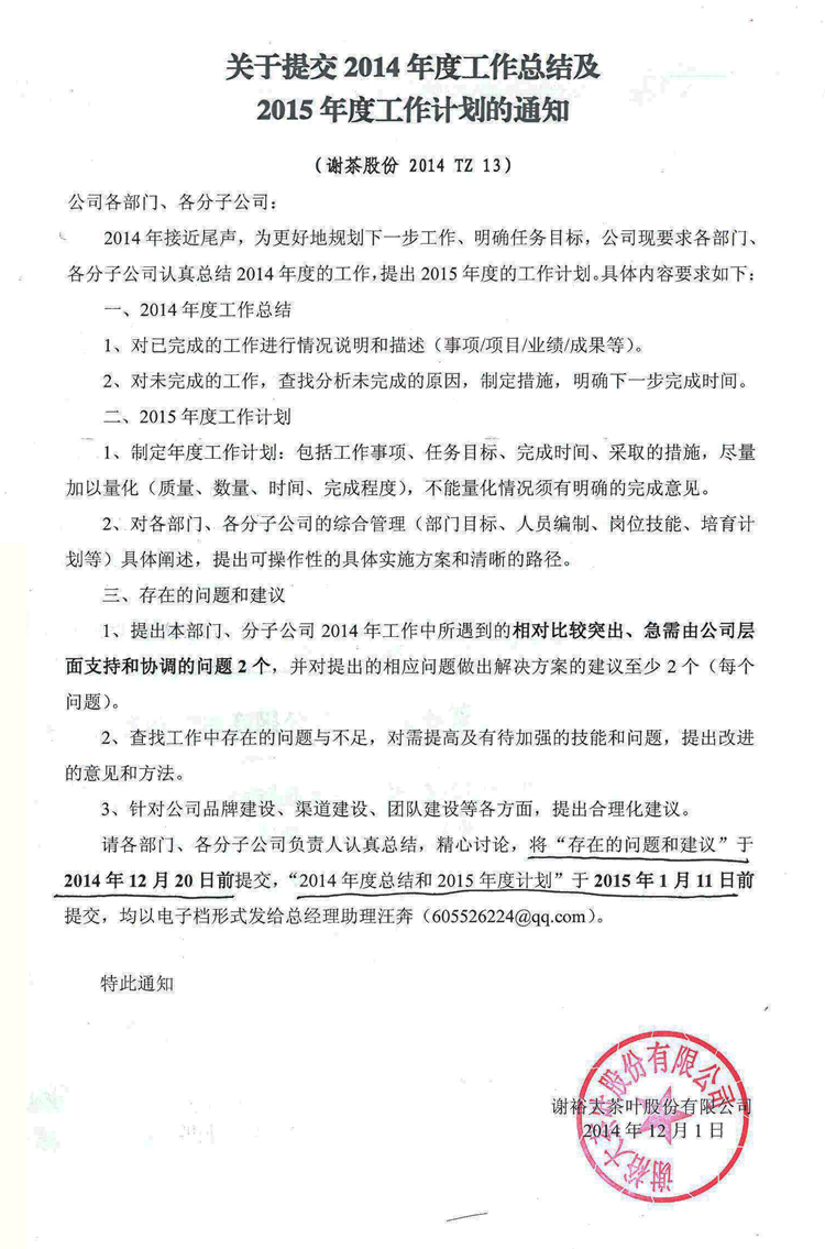 請各部門、各分子公司負(fù)責(zé)人認(rèn)真總結(jié),精心討論,將“存在的問題和建議”于2014年12月20日前提交,“2014年度總結(jié)和2015年度計(jì)劃”于2015年1月11日前提交,均以電子檔形式發(fā)給總經(jīng)理助理汪奔(605526224@qq.com)。