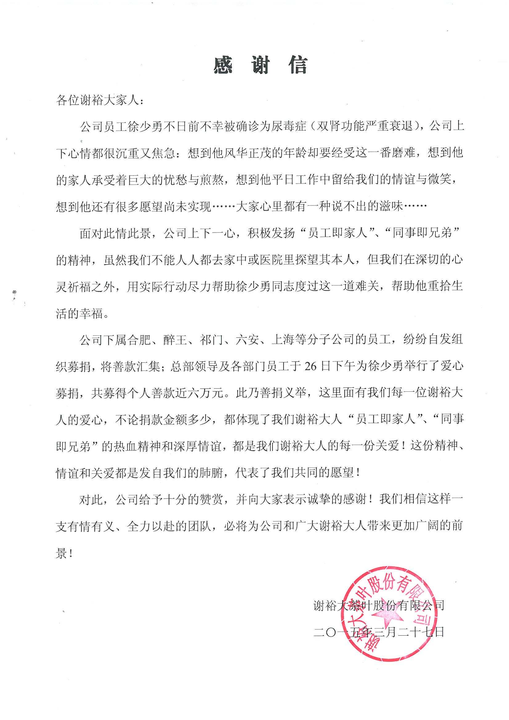 3月26日下午,謝裕大公司黨、團支部、工會和行政部門發(fā)出倡議并組織了“關(guān)愛一家人·溫暖謝裕大”的愛心募捐儀式,為團購部員工徐少勇捐款獻愛心。