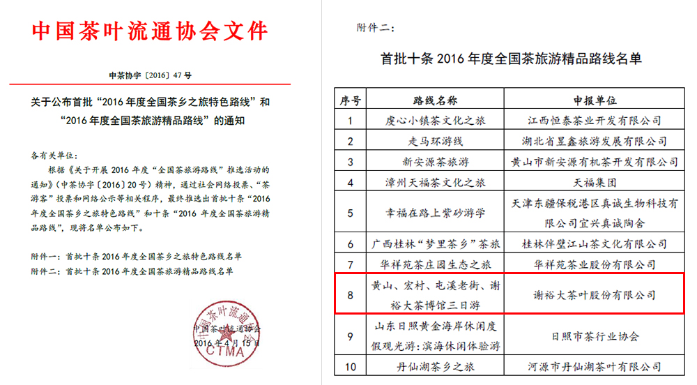 4月15日,中國茶葉流通協(xié)會官網(wǎng)(www.ctma.com.cn)對首批 “2016年全國茶鄉(xiāng)之旅特色路線”(十條)和“2016年度全國茶旅游精品路線”(十條)的最終入選名單進行了公告(www.ctma.com.cn/ctma_news/dt/2016/0415/56994.html),由謝裕大茶葉股份有限公司申報的謝裕大茶旅路線,即“黃山、宏村、屯溪老街、謝裕大茶博館三日游”成功入選“全國茶旅游精品路線”的榜單,游客朋友們在這條路線上的每一個處都能夠與謝裕大零距離接觸,體味裕大茗香,感受徽茶文化,盡享心靈旅行!