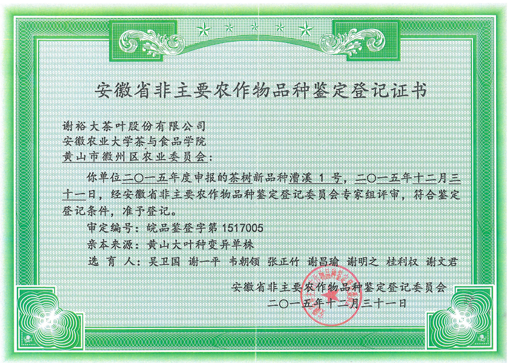 近日謝裕大又傳喜訊,經(jīng)過安徽省非主要農(nóng)作物品種鑒定登記委員會專家組考核評審,謝裕大2015年度申報的茶樹新品種“漕溪1號”符合鑒定登記條件,成功獲得“安徽省非主要農(nóng)作物品種鑒定登記”證書。