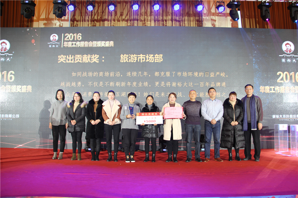 隨后,伴著喜慶的音樂,在謝裕大行政總監(jiān)戴志剛的主持下舉行了“頒獎典禮”。董事長謝一平、總經(jīng)理楊義云等公司諸高層領(lǐng)導(dǎo)分別為 2016 年度謝裕大“漕溪精神獎”、“突出貢獻獎”、“先進工作者”等獲得者頒獎。其中“漕溪精神獎”從今年開始設(shè)立,也是我們謝裕大茶人的年度至高榮譽。漕溪是謝裕大品牌的起源地,也見證者謝裕大的百年成長。漕溪精神是對老一代謝裕大人的勤勉堅韌、艱苦奮斗的創(chuàng)業(yè)路的精準詮釋,也一直引領(lǐng)者謝裕大一代又一代茶人的成長。漕溪精神獎的設(shè)立旨在與大家共同見證這種精神的綿綿傳承與歲月記載,也正是有了像他們一樣的漕溪精神者們的共同打拼和奉獻,才成就了謝裕大的今天!
