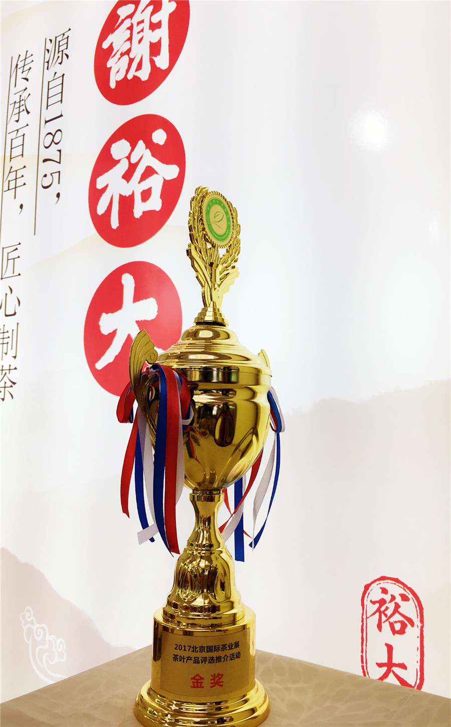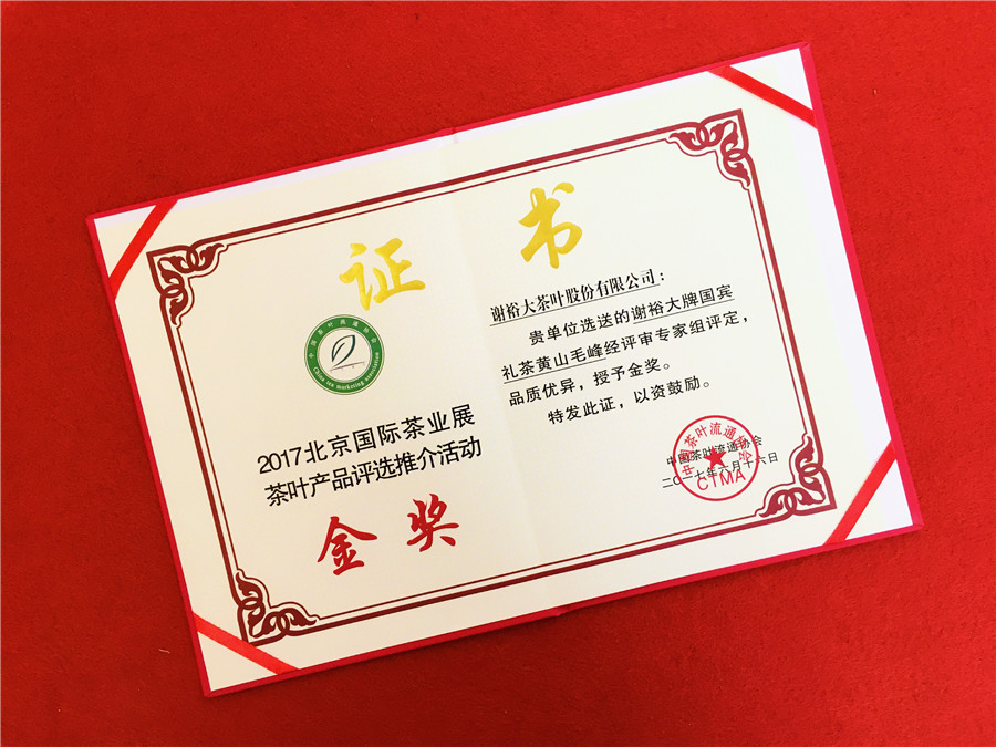在“2017北京國際茶業(yè)展茶葉產(chǎn)品評選推介活動”中,謝裕大選送的“國賓禮茶黃山毛峰”再次拔得頭魁,榮獲金獎!這已是謝裕大繼2015、2016年后第三次榮獲北展茶葉產(chǎn)品評選推介活動的金獎,謝裕大用始終如一的茶葉品質(zhì)向世人彰顯了“黃山毛峰第一家”的實力!