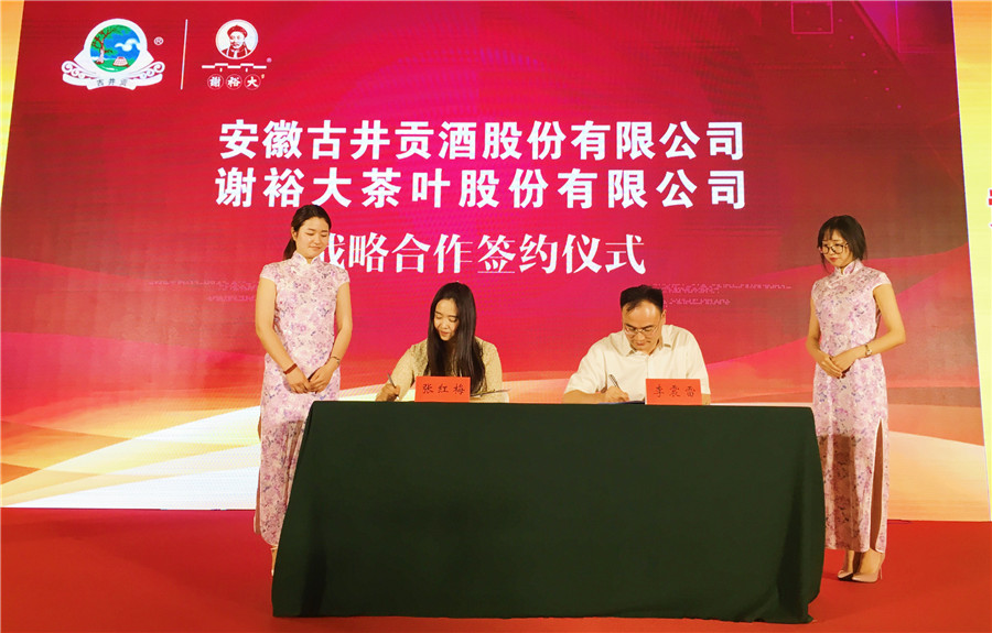 安徽省物產(chǎn)豐富,自古皖南產(chǎn)名茶,皖北制佳釀。此次北京國際茶博會期間,謝裕大還與安徽龍頭白酒品牌古井貢強(qiáng)強(qiáng)聯(lián)合,雙方將以安徽知名特產(chǎn)聯(lián)合開發(fā)與銷售為契機(jī),逐步進(jìn)行跨領(lǐng)域多方位高層次的戰(zhàn)略合作。在黃山名茶推薦會現(xiàn)場,安徽古井貢酒股份有限公司、謝裕大茶葉股份有限公司相關(guān)負(fù)責(zé)人簽署了戰(zhàn)略合作協(xié)議,并現(xiàn)場展示了雙方聯(lián)合開發(fā)的首款茶酒組合禮盒產(chǎn)品。此次強(qiáng)強(qiáng)聯(lián)手不僅有利于古井貢和謝裕大品牌再升級,也對宣傳安徽文化具有重要意義。