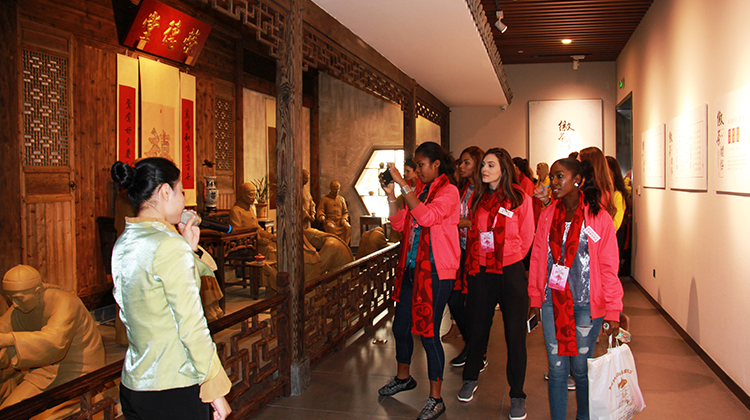 隨后大家依次參觀了古色古香又不失現(xiàn)代園林風的謝裕大茶文化博物館,她們一邊傾聽關(guān)于徽州茶文化的英文講解,一邊感嘆于謝裕大百年歷史的傳承和厚重的文化底蘊;尤其對徽州茶文化的茶俗部分十分感興趣,不停地與英文翻譯進行詢問溝通,興致勃勃的互相合影留念。