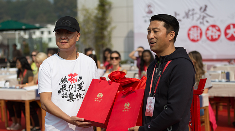 謝裕大常務(wù)副總謝毅強(左)向新絲路集團總裁李冰先生(右)贈送茶禮