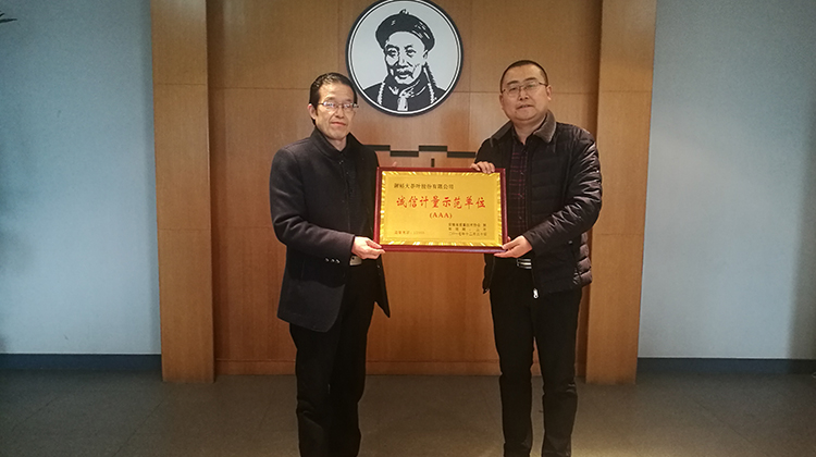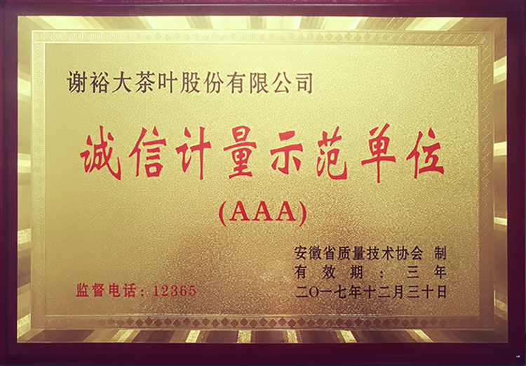 2018年3月16日,受安徽省質監(jiān)局委托,黃山市質監(jiān)局黨組副書記、副局長程建軍攜計量科科長曹宏文為謝裕大授牌“安徽省誠信計量示范AAA級單位”榮譽稱號。在企業(yè)自愿申報,相關區(qū)縣市場監(jiān)管局初選和市質監(jiān)局推薦基礎上,省質監(jiān)局委托省計量協(xié)會組織專家,對黃山市推薦的謝裕大茶葉股份有限公司等3家單位進行了“誠信計量示范單位”現(xiàn)場評價符合誠信計量示范單位評價要求后授予“安徽省誠信計量示范單位(AAA級)”榮譽稱號。