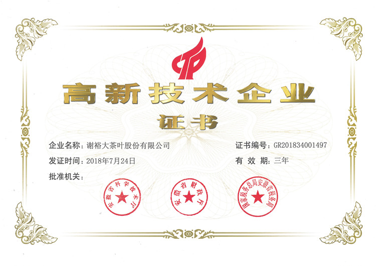 近日,全國高新技術(shù)企業(yè)認(rèn)定管理工作領(lǐng)導(dǎo)小組辦公室發(fā)布了:安徽省2018年第一批1517家企業(yè)擬認(rèn)定高新技術(shù)企業(yè)名單,謝裕大不負(fù)眾望,再次進(jìn)入本次公示名單之列。這是謝裕大自2012年首次通過“高新技術(shù)企業(yè)認(rèn)定”以來,三年一個(gè)周期,2018年再獲殊榮,連續(xù)第三次被認(rèn)定為“高新技術(shù)企業(yè)”。