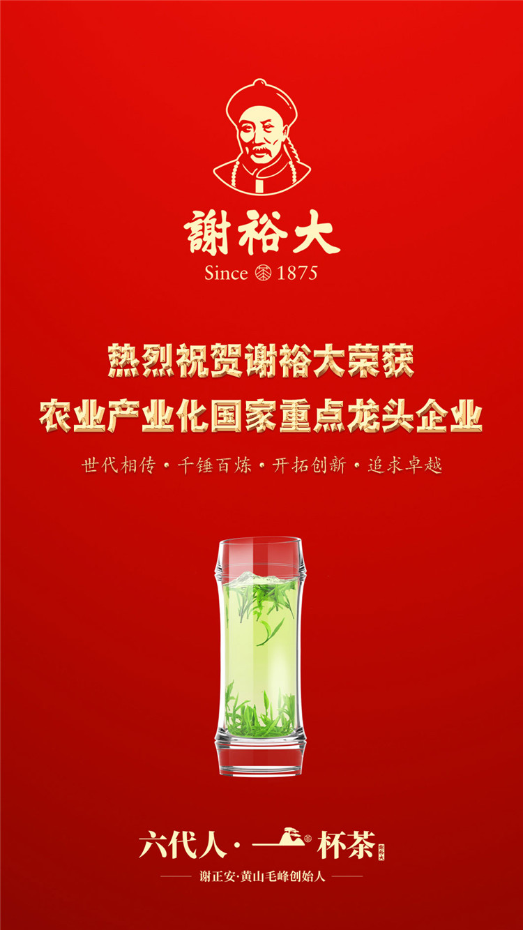 2018年謝裕大可謂喜事連連,本次榮獲“農(nóng)業(yè)產(chǎn)業(yè)化國家重點(diǎn)龍頭企業(yè)”是今年繼謝裕大再次通過“高新技術(shù)企業(yè)認(rèn)定”,榮獲“2018中國茶業(yè)最受消費(fèi)者認(rèn)可十強(qiáng)企業(yè)”、 “2018年度安徽名牌”、 “安徽省誠信計(jì)量示范AAA級(jí)單位”“安徽省企業(yè)標(biāo)準(zhǔn)化良好行為AAA級(jí)示范企業(yè)”、“2017年度省認(rèn)定企業(yè)技術(shù)中心認(rèn)定”,董事長謝一平入選首批 “中國制茶大師”等榮譽(yù)后獲得的又一殊榮!