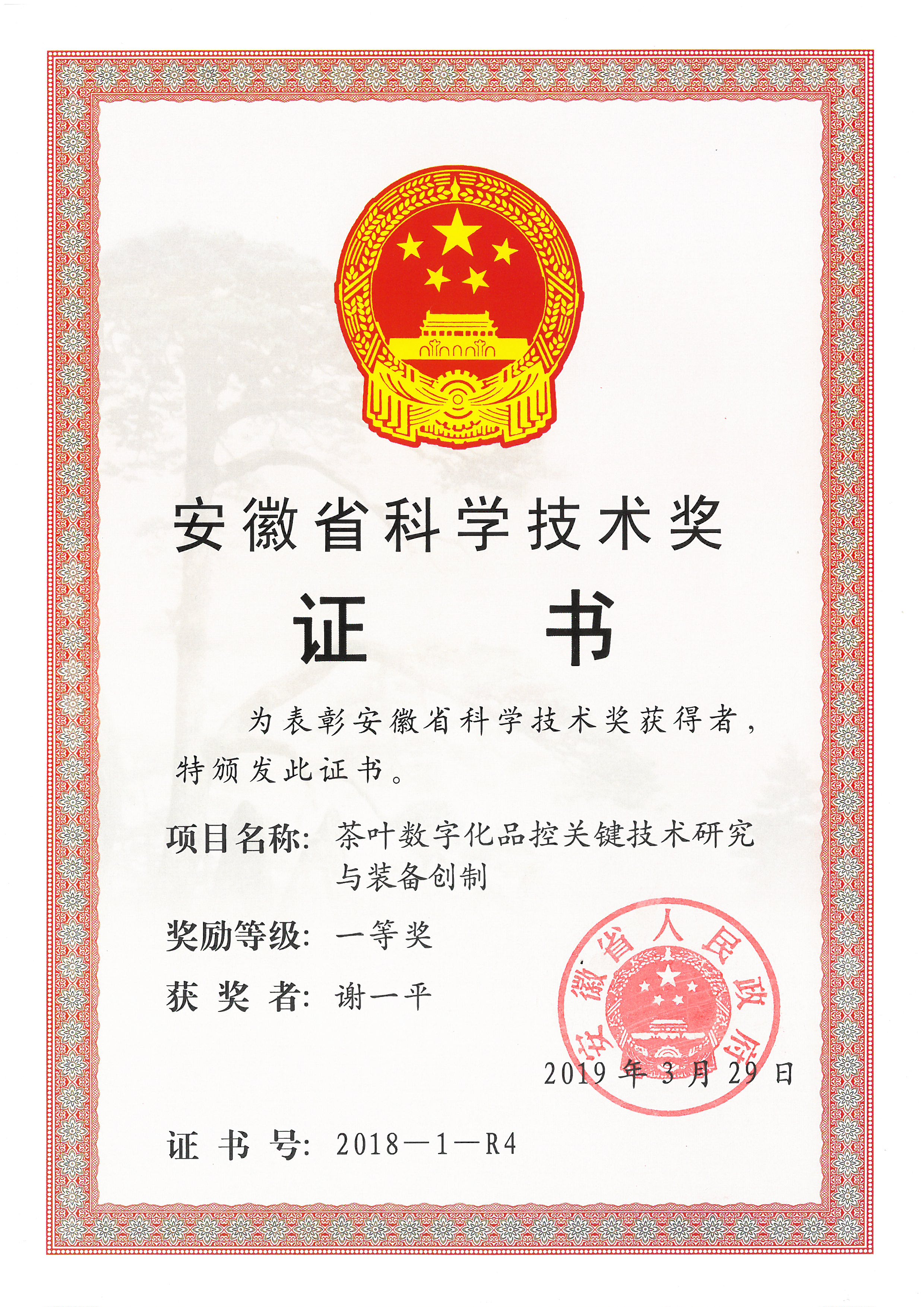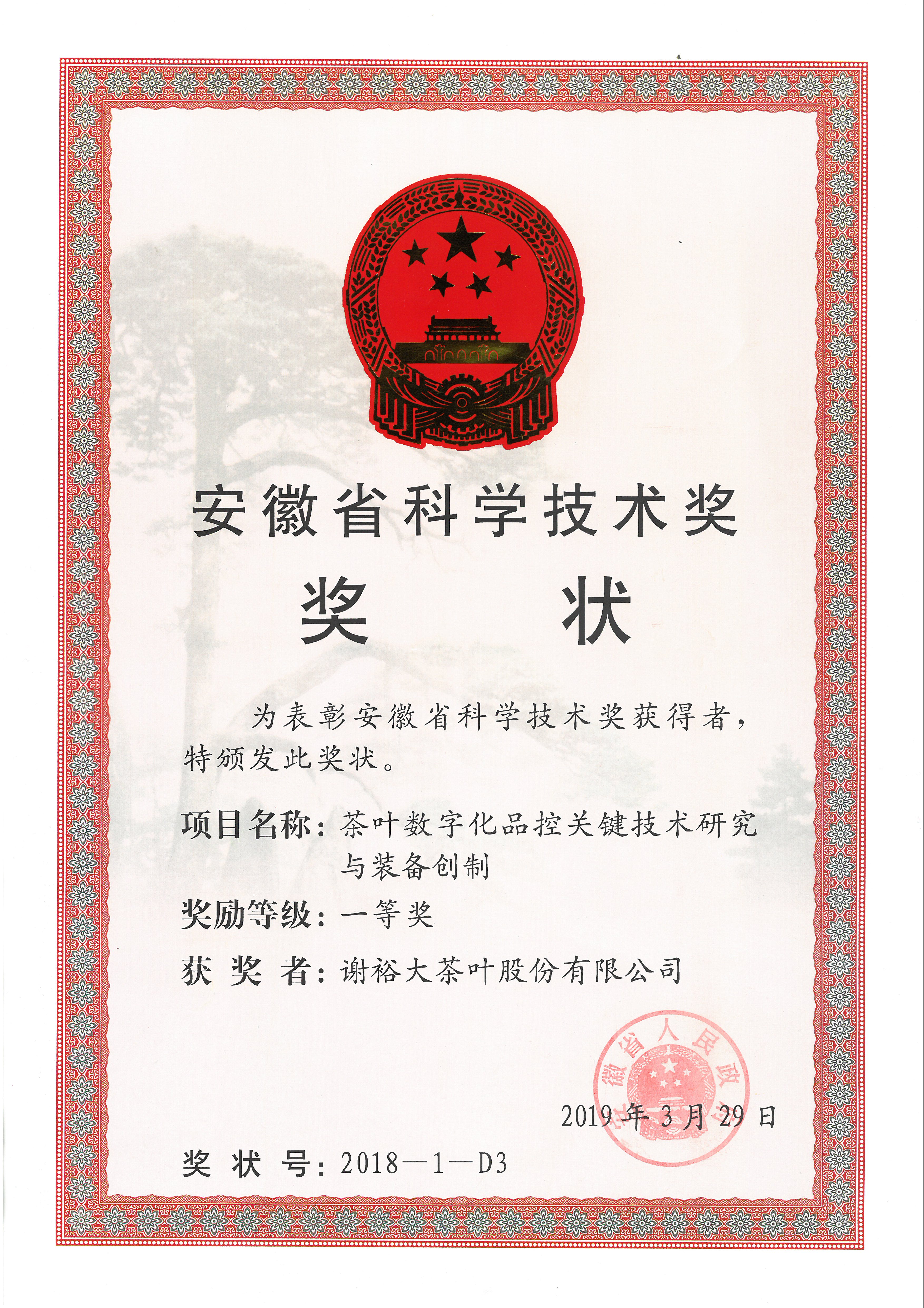 謝裕大與安徽農(nóng)業(yè)大學(xué)為產(chǎn)學(xué)研合作單位,謝裕大作為“茶葉數(shù)字化品控關(guān)鍵技術(shù)研究與裝備創(chuàng)制”項(xiàng)目的共同完成單位被評為省科技進(jìn)步獎一等獎,董事長謝一平作為共同完成人,獲得省科技進(jìn)步獎一等獎個人認(rèn)證。