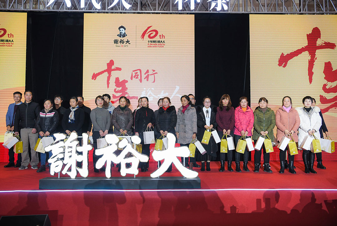 謝裕大生產(chǎn)總監(jiān)馮濤(左一)為新一批“十年同行裕大人”獲得者贈(zèng)禮