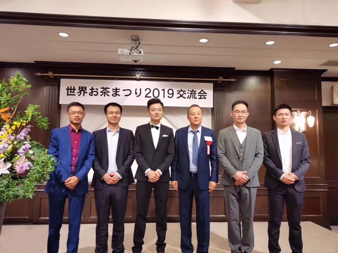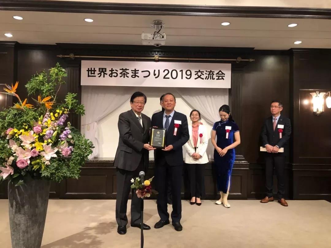 接受日本靜岡縣知事、世界綠茶協(xié)會(huì)會(huì)長(zhǎng)川騰平太(左)頒發(fā)的榮譽(yù)獎(jiǎng)牌