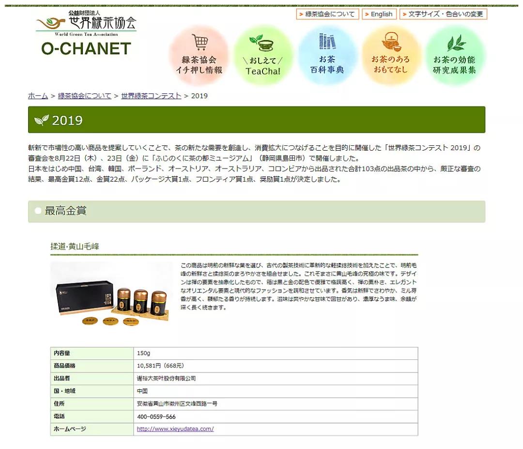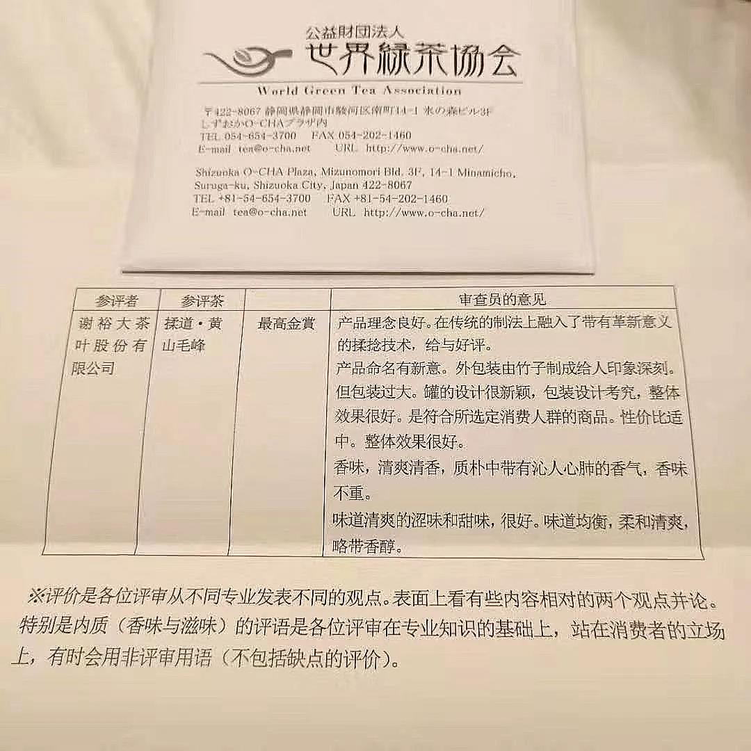 11月7日,謝裕大生產(chǎn)研發(fā)團(tuán)隊(duì)受邀奔赴日本靜岡,出席「2019世界綠茶評(píng)比會(huì)」舉辦的頒獎(jiǎng)典禮。今年8月,由謝裕大出品的“揉道·黃山毛峰”從世界綠茶最高級(jí)別評(píng)選活動(dòng)之一的「2019世界綠茶評(píng)比會(huì)」中脫穎而出,斬獲評(píng)比會(huì)最高級(jí)別獎(jiǎng)項(xiàng)——“最高金獎(jiǎng)”。世界綠茶評(píng)比會(huì)是國(guó)際上綠茶評(píng)比最具權(quán)威、級(jí)別最高的茶評(píng)選活動(dòng),被稱為“世界綠茶奧斯卡盛典”。