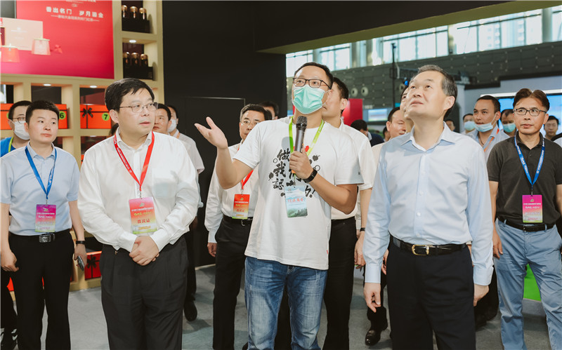 向張正竹副市長(中)等領(lǐng)導(dǎo)匯報謝裕大布展工作