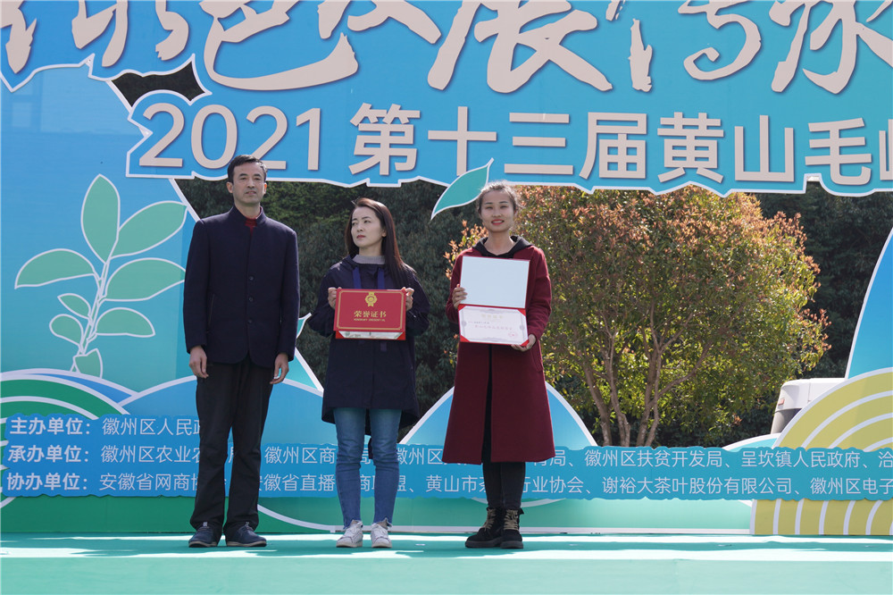 黃山本土知名主播“黃山婷婷”(中)、“更秋”(右)頒獎