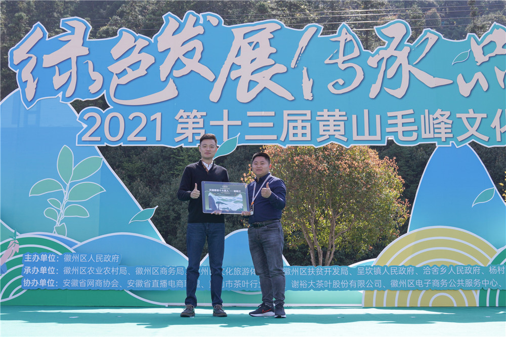 今年天貓春茶山河行活動再次來到黃山毛峰文化節(jié)的活動現(xiàn)場,連接源頭好茶,為本屆文化節(jié)添助力。在活動現(xiàn)場,阿里巴巴天貓茶行業(yè)負責人兆濂向謝裕大品牌第六代傳人謝明之頒發(fā)了天貓春茶十大匠人之黃山毛峰匠人獎牌,并共同開啟天貓春茶山河行黃山站線上活動。