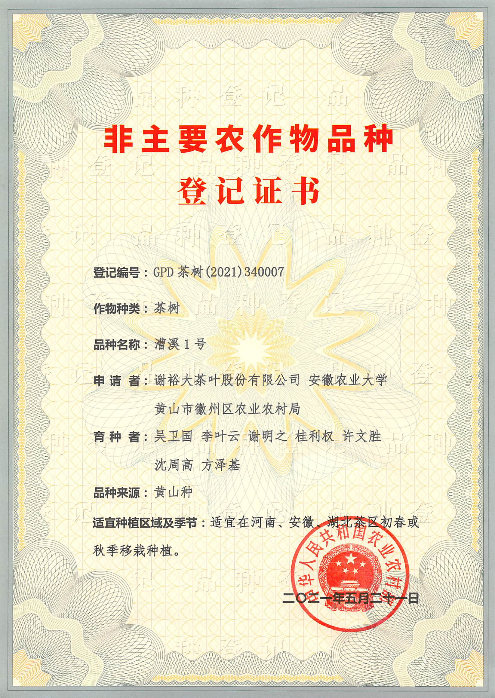 近日,中華人民共和國(guó)農(nóng)業(yè)農(nóng)村部發(fā)布第426號(hào)公告,依據(jù)《種子法》《非主要農(nóng)作物品種登記辦法》,由謝裕大茶葉股份有限公司、安徽農(nóng)業(yè)大學(xué)和黃山市徽州區(qū)農(nóng)業(yè)農(nóng)村局選育的“漕溪1號(hào)”茶樹品種,符合登記要求,予以品種登記,登記編號(hào):GPD 茶樹(2021) 340007?!颁钕?號(hào)”成為黃山市首個(gè)國(guó)家品種登記的茶樹品種,并率先成為我省四大名茶首個(gè)擁有適制性國(guó)家級(jí)無性系良種,為黃山毛峰茶提質(zhì)增效、高質(zhì)量發(fā)展奠定了良好基礎(chǔ)。
