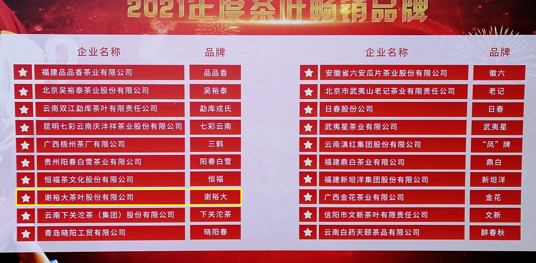 謝裕大已連續(xù)十余年榮獲“年度百強企業(yè)”,這份榮譽是對謝裕大多年來堅持匠心品質、品牌引領、文化傳承等多方面成果的認可和肯定。本次“2021年度茶業(yè)暢銷品牌”的評選,需對各大茶企參評的品牌進行包括——品牌影響力、品牌美譽度、市場活躍度等多方面因素進行綜合考量,最終經(jīng)專家組嚴格審查、一致評分方能當選。謝裕大憑借過硬的綜合實力載譽登榜,獲得業(yè)界嘉賓、專家等的一致稱贊與好評。