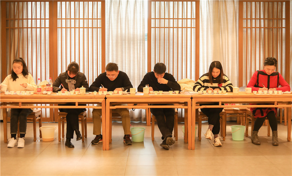 實(shí)操板塊分為六大基本茶類干茶辨識(shí)、茶湯辨識(shí)找對(duì)杯和茶湯沖泡比氣(香氣)味(滋味)三個(gè)分項(xiàng)賽。其中,干茶辨識(shí)環(huán)節(jié)共8分鐘,在六大基本茶類中選取6款代表性茶樣,進(jìn)行辨識(shí)后寫(xiě)明品名、產(chǎn)地、歸屬;茶湯辨識(shí)環(huán)節(jié)選手從5款茶湯中通過(guò)“觀色”、“聞香”、“品湯”選出兩杯茶品類相同的茶湯;15分鐘沖泡環(huán)節(jié)為兩人一組,每人被隨機(jī)指定沖泡2款茶,由工作人員呈至七人評(píng)委組進(jìn)行盲評(píng)打分。期間,沖泡環(huán)節(jié)現(xiàn)場(chǎng)尤為激烈,經(jīng)過(guò)前期一個(gè)月的練習(xí)準(zhǔn)備,每組選手都摩拳擦掌,紛紛亮出絕技,熟練地進(jìn)行溫杯、洗茶、注水、出湯等操作,充分展現(xiàn)了專業(yè)的個(gè)人技能及敬業(yè)態(tài)度。