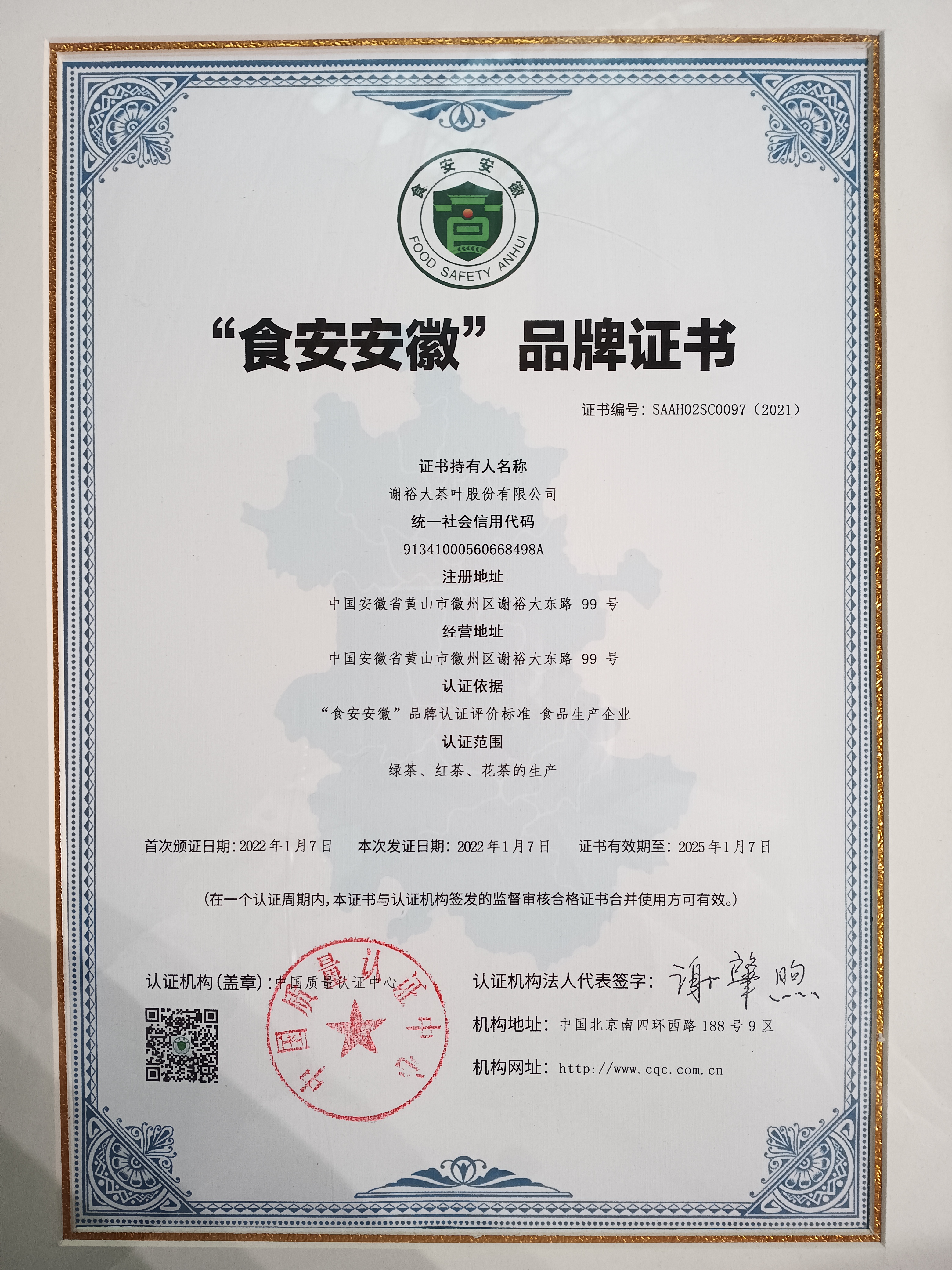 “食安安徽”是我省目前食品領(lǐng)域唯一且最高的品牌,謝裕大多年來高度重視產(chǎn)品質(zhì)量建設(shè)和食品安全,秉持“世代相傳、千錘百煉、開拓創(chuàng)新、追求卓越”的企業(yè)質(zhì)量方針,對(duì)食品安全嚴(yán)苛把控、對(duì)技術(shù)創(chuàng)新不斷追求、對(duì)品質(zhì)堅(jiān)守始終如一。作為“食安安徽”首批認(rèn)證企業(yè),謝裕大必將不負(fù)厚望,進(jìn)一步落實(shí)食品安全管控常態(tài)化,堅(jiān)決守住食品安全底線,為消費(fèi)者提供安全、綠色、健康的茶葉產(chǎn)品,為推進(jìn)“食安安徽”品牌建設(shè),促進(jìn)企業(yè)高質(zhì)量發(fā)展做出表率。