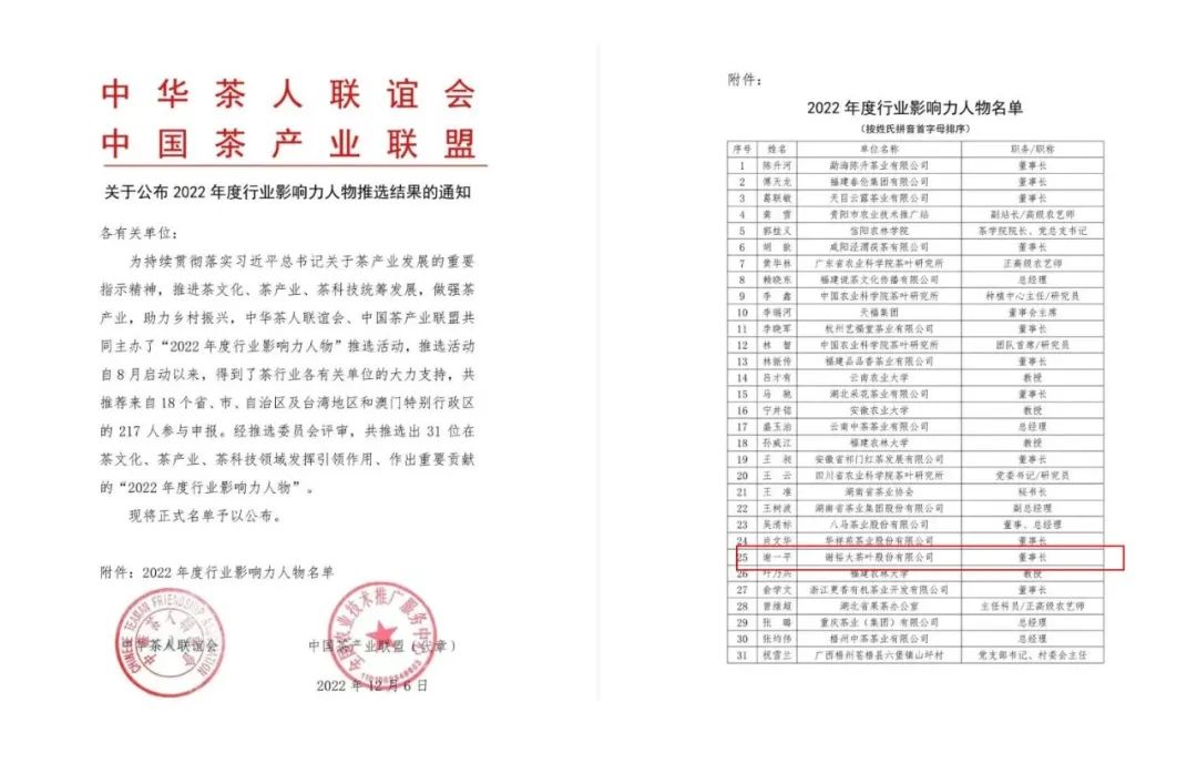 此外,中華茶人聯(lián)誼會聯(lián)合中國茶產(chǎn)業(yè)聯(lián)盟共同主辦的“2022年度行業(yè)影響力人物”推選活動(dòng)于3月1日正式發(fā)布宣傳片?;顒?dòng)共推薦來自全國各地的217人,最終僅推選出在茶文化、茶產(chǎn)業(yè)、茶科技領(lǐng)域發(fā)揮引領(lǐng)作用、作出重要貢獻(xiàn)的“2022年度行業(yè)影響力人物”31位,謝裕大公司董事長謝一平入選,充分肯定了謝裕大為三茶統(tǒng)籌發(fā)展所做的貢獻(xiàn)。