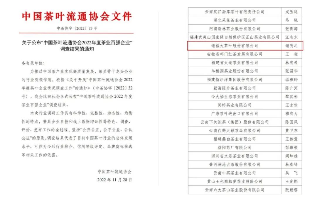 謝裕大榮獲“2022中國茶業(yè)百強(qiáng)企業(yè)”