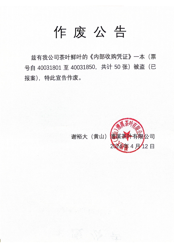 茲有我公司茶葉鮮葉的《內(nèi)部收購憑證》一本(票號自 40031801至40031850,共計50張)被盜(已報案