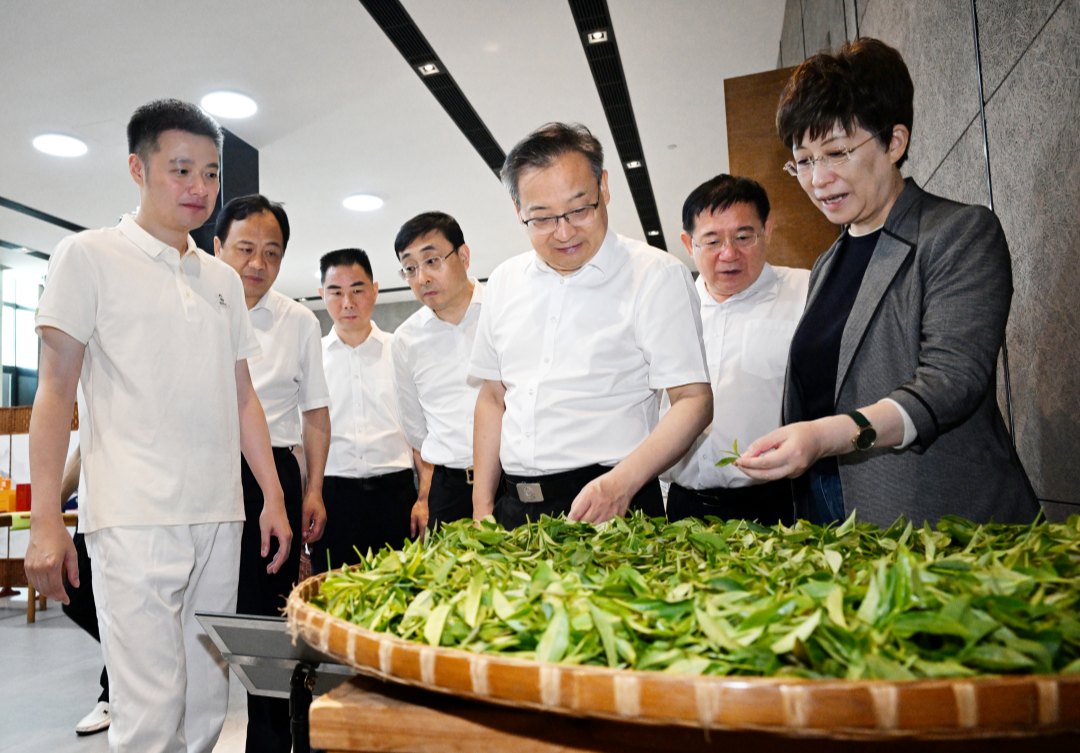 省委書記梁言順(中)在謝裕大茶博園,察看非遺手工制茶坊,向謝裕大總經(jīng)理謝明之(左一)現(xiàn)場了解茶制作技藝、品牌建設(shè)等情況,市委書記凌云(右一)等領(lǐng)導(dǎo)同行。
