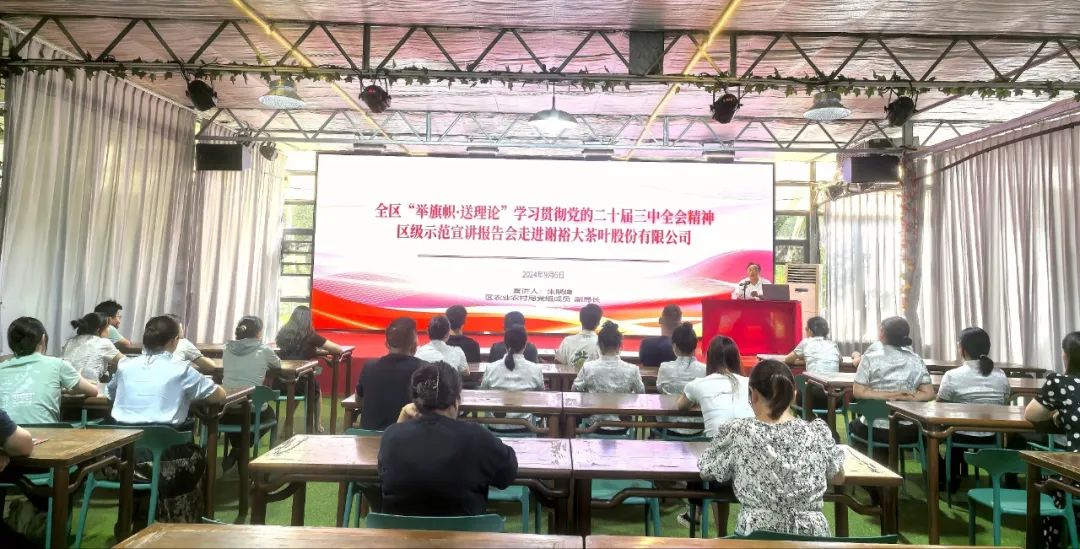 2024年9月6日,謝裕大在茶緣閣會(huì)場(chǎng)舉行“舉旗幟·送理論”學(xué)習(xí)貫徹黨的二十屆三中全會(huì)精神示范宣講報(bào)告會(huì),徽州區(qū)農(nóng)業(yè)農(nóng)村局副局長(zhǎng)朱曉峰作宣講報(bào)告,謝裕大包括黨員在內(nèi)各部門員工代表共同參加。
